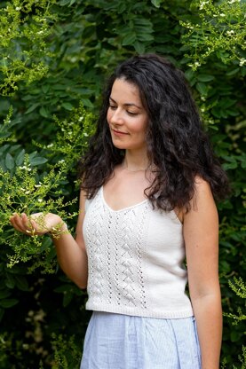 Albena is a romantic summer tank top, whose lightness and ease of wear will make it your preferred garment for warm weather. It is an elegant top with a V-neckline and a delicate lace panel at the front, discreet enough to reveal just a little of the body.