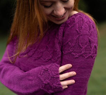 Alcyone the sweater has twist stitch stars in the yoke, 5 different sizes of them so that the decorations are in proportion to the sizes. It is worked bottom up, in the round. The trunk is all stockinette above the decorative edging, so there is plenty of plain knitting to work your favorite shaping modifications in. The hems and yoke are decorated in twist stitch hexagons and stars.