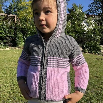 Structure knit cardigan in soft merino wool, zipper and pockets. It has a cosy hood and stripe details. The structure knit is easy, you only use knit and purl. Front- and back panels are knitted in one piece, so there are no side seams to sew. The pattern also includes photos, sketches of all pattern pieces and a list of abbreviations. The cardigan can be machine washed using a wool program.