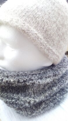 Alex was designed to be a simple and quick knit that will keep anyone warm. The suggested bouclé wool yarn adds some visual interest and bumps up the warmth. Knitting two strands together creates a thicker, warmer fabric too!