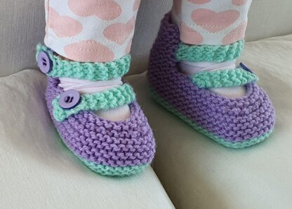 These 8ply garter stitch shoes are knitted in two colours, and have a high back and two buttoned straps.