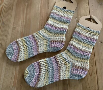 „Alexandrine“, schöne Socken die durch Musterstreifen in Halbpatent sogar Volumen bekommen. Die Socken werden von oben nach unten gestrickt. Die Grundlagen des Sockenstrickens sollten bekannt sein. Ich habe die Ferse als klassische Ferse (mit Halbpatent) gearbeitet und eine Bandspitze gestrickt und beschrieben. Ferse und auch Spitze können jedoch auch anders ausgeführt werden.