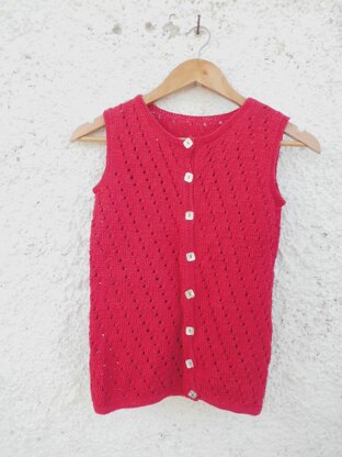 ALISON - a beautiful and practical plain coloured sleeveless jumper in DK-weight cotton - made for my eldest granddaugther. The pattern is a simple lace pattern worked from chart. The jumper has been worked flat on circular needles from one front edge across the back to the other front edge until armholes - no side seams. All borders are in garter st. Written pattern with chart. This charming design applies to girls. Skill level required from 1 (beginner) to 5 (advanged): 3↑. The measurements given troughout the pattern are all in cm as well as in inches.