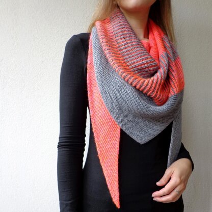 This modern triangular shawl features a fun mix of garter colour blocks and squishy brioche stitch in two colours.