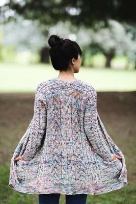 This cardigan coat is worked seamlessly from the top down, with a creative and challenging construction. Are you ready for a wonderful festival of cables, lace and color?