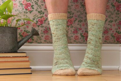 This sock pattern is was designed in reference to the part of book which talks about the doll’s parasol that is trimmed with lace. All Trimmed with Lace is knit toe-up with a parasol lace stitch pattern that runs up the front of the sock. The back is trimmed with your choice of lace hearts or flowers.