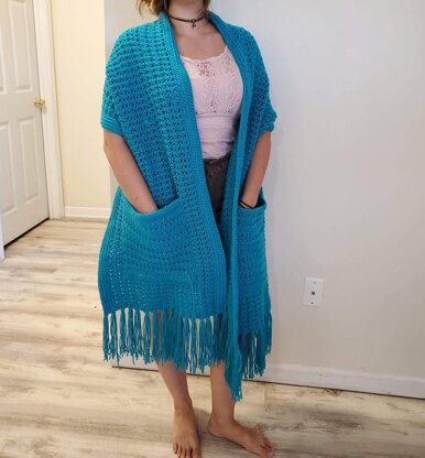 Advanced beginner to Intermediate pattern for a cozy pocket shawl. Pattern PDF includes written instructions in American English as well as detailed instructions for the special stitches and images for reference. Pattern includes several areas where you can work it as written or choose one of the variations. Final measurements are 67 inches x 20 inches without tassels, but I've included instructions for adjusting both the shawl's length and width if desired.