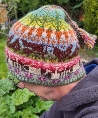 This is a colourwork hat knitted in scraps of KDD Milarrochy Tweed in 17 shades but could also be worked in Jamiesons Spindrift or J&S jumper weight, or Knit Picks palette. Written and charted instructions are provided and the pattern has been test knitted. You do not need to use as many as 17 shades, and advice is given about choosing colours in other yarns.