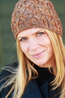 Allotropes are different structural forms of the same element. This richly textured hat with its lattice of cables reminds me of diamonds in knitted form as it uses cleverly placed purl stitches in place of more complex smocking to create a lovely textured effect. The sophisticated all over cable pattern is fairly easy to execute making this a great project to learn how to cable without a cable needle. For anyone who’s a little scared of cables, this might be just the project to get you going. The final piece is very simple and wearable – and it comes in lots of sizes, so you can knit it to fit and flatter any head!