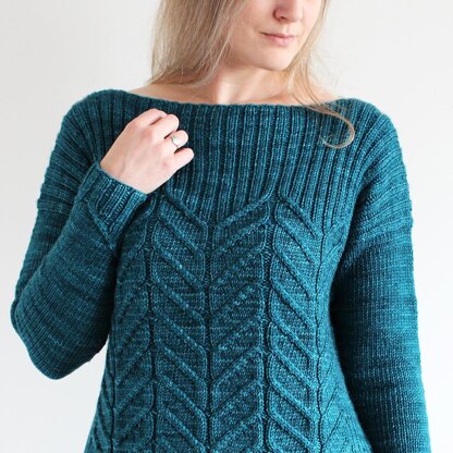 This beautiful sweater features a large, eye-catching cable motif that elegantly transitions into a wide ribbing. The cables wonderfully highlight the front and back of the sweater as well as the sleeve cuffs.
