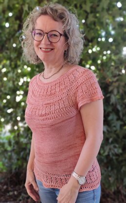 Almudena is a very light summer sweater that I recommend knitting with a very fresh fiber, such as bamboo. Although you also have a version in French sleeves or long sleeves, you can knit it for any season and any yarn. The construction is very simple: you start in the neck and knit top-down, starting with a round yoke decorated with very easy but very colorful lace. When reaching the widest area of the chest, the body is separated from the sleeves, which you leave on hold. The straight body is continued and finished with the same motif as in the yoke to close with an i-cord edge. Waiting sleeves also close in a couple of rounds with an i-cord, although you can choose to lengthen it with a French or long sleeves of your choice.