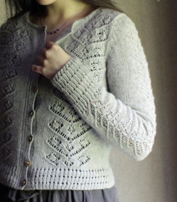 Stalks of blooming aloe vera plants are what I see in the stitch pattern on the front of this sweater. On the sleeves, a similar but narrower pattern. And to add to the swoon factor - pretty eyelet ribbing!