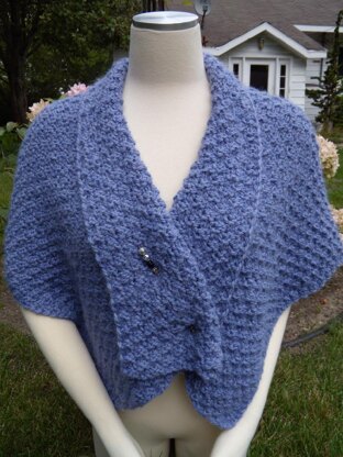 This V-shaped shoulder shawl features a turned back lapel and a stitch pattern that is reversible. The lofty alpaca gives the garment warmth and luscious drape. The model pictured used all the yarn, so you may want to purchase additional skeins if you are a very loose knitter or would prefer to have a slightly longer garment in the front.