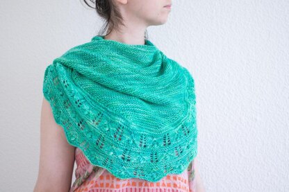 Bottom-up shawl with a lace border and a garter stitch short row body.