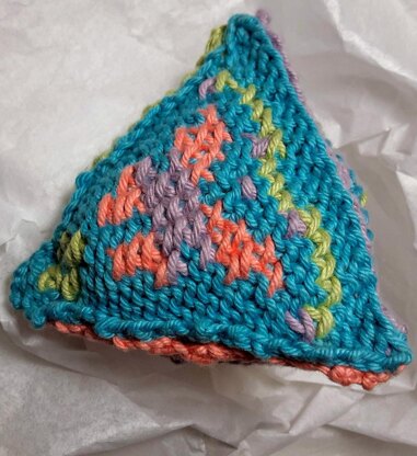 100% cotton, worsted weight yarn. Shown in Knit Picks Dishie colors azure, lilac mist, honeydew, and conch. 20 yards each color. No. 7 U.S. straight needles, fiber filling, and tapestry needle. Edges 4.25 inches. Height 4 inches.