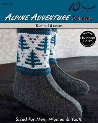 Celebrate the snowy season with a pair of multicolor, mukluk-style slippers! Knitted seamlessly in the round, these handsome high tops feature a forest of spruce trees atop a body of Stockinette. Worked with one color at a time, the simple knit-and-slip pattern automatically creates the colorwork without the fuss of Fair Isle knitting. Even better? There’s no sewing or finishing required. So you can just knit ‘em and wear ‘em!
