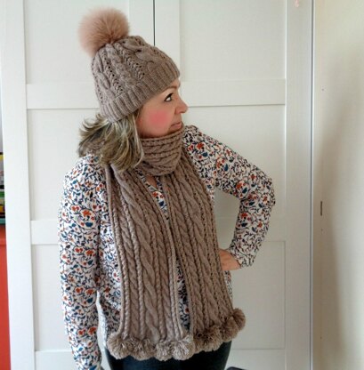 Alpine Set Scarf and Hat knitting pattern create a great texture mixing cables and lace stitch, the lovely pom-poms finishing give a cozy look to this timeless design. Big and super warm, great for going to sky, mountains or just to wrap yourself on a cold winter day, enjoy!