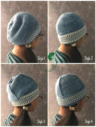 Satu topi, 4 gaya. Kombinasi manis antara simple double knitting dan stockinette st. Terdapat 3 ukuran, dengan benang DK weight ini merupakan proyek yang tidak memakan waktu. (bila mengalami kesulitan bertransaksi di sini, silahkan hubungi saya)