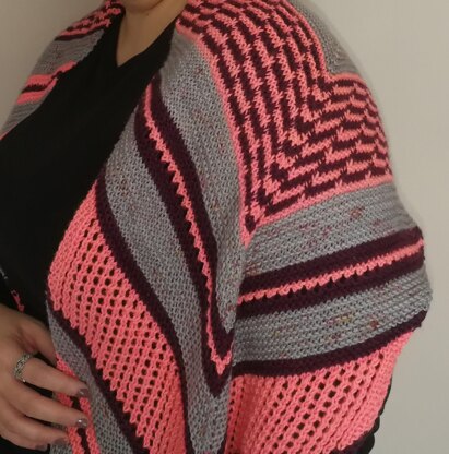 Casting on with just 3 stitches, it’s knit in a Chevron style that moves away from each other, end to end, building up to an even set amount of stitches and then tapering back down to 3 stitches for bind off. It uses nearly 4 skeins of DK weight yarn, 2 for the main colour & 2 contrasting, but you can mix it up even more by using 2 main colours, so you’ll have a different background for each half - there’s a midway point stated in the pattern where you can add extra rows in to enlarge the wrap, that’s where you could also change to your second ‘main colour’ to begin the second half. With the construction of Chevrons that work away from each other, I aimed to achieve a flexible almost boomerang-like middle of the wrap shaped by the angles created there, that makes the resulting fabric easier to curl around your neck