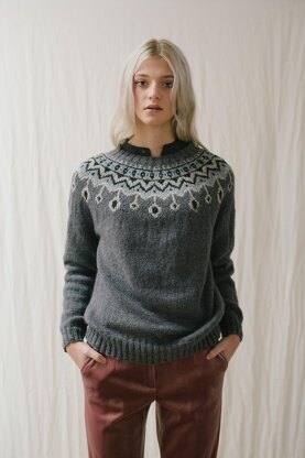 Worked bottom up in the round. Stranded colourwork yoke with short row shaping to form front neck drop. DK yarn worked on 3.75mm needles to give slightly tighter fabric.