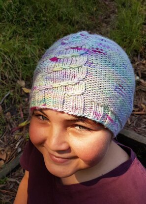 This fun hat with a Unicorn Horn Motif in cables stands out against a reverse stocking stitch hat.