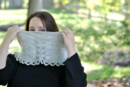 Ameliamont is cowl that begins with loopy loops. A simple floral leaf motif and "winged" 3-stich cables are combined to create a sweet little accessory.