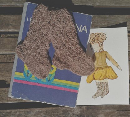 Amelia’s socks are knee- high all over lace socks, with slipped stitch heel flap. Sock are work cuff down. For looser top of leg, they are started with bigger needle.