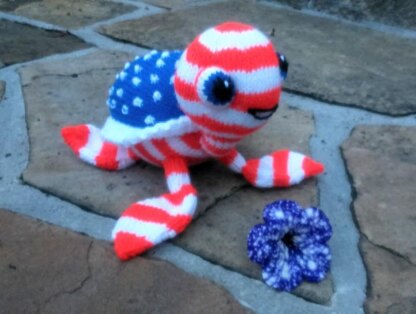 This American Flag Sea Turtle is knitted flat and then seamed. The 50 ‘stars’ of the American flag are created by a series of bobbles in a contrasting color. Step by step instructions are given for each piece and there’s a section at the end to show you how to put them all together