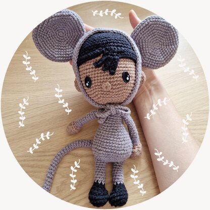 2 balls for skin, Chocolate (057) 3 balls for the main colour, Mouse Grey (059) 1 ball for hair and shoes, Black (060) x2 16mm oval eyes, Alternatively, use 10-12mm round eyes. 2.5mm Hook size Toy Stuffing Tapestry Needle Pins Stitch Marker Wire or wooden dowel for neck support