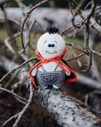 Yarn Scheepjes SOFTFUN Fibre content: 60% cotton, 40% acrylic Yarn weight: DK Length: 140 meter Ball weight: 50 gram Colours: off-white (skin tone), grey for the pants, black and red for the cloak.