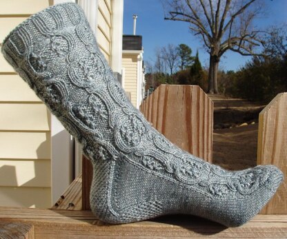 This is a lace sock that can be knit from the toe up or from the cuff down, with a slip stitch heel. There are 2 sizes. Small is a 64 stitch leg, Medium is a 72 stitch leg. There is an option to do the toe in an eye of partridge stitch.