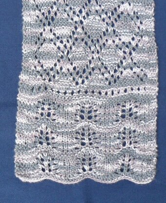The scarf features a scalloped lace pattern at the ends, and uses a garter-stitch diamond lace pattern through the body of the scarf to show off the beautiful tonal variations of this variegated yarn. The pattern includes both charted and written directions for the lace patterns. Please note that the yarn used to knit the sample has a lot of drape (think 100% silk or rayon), so if you use a yarn that has more bounce, such as wool or acrylic, you may need more yardage to make a full-length scarf.
