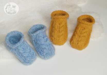 Design details: ● baby booties, baby shoes ● seamless, worked in one piece ● worked from cuff in the round ● with cable pattern using cable needle ● Kitchener st for grafting the last sts on the Toe