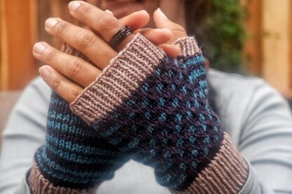 Amphi Mitts are fingerless mitts featuring checkered slip-stitch colorwork on one side and stripes on the other. Both of these techniques involve working with only one color at a time. The ribbing is done in a 3rd neutral color for a polished look.
