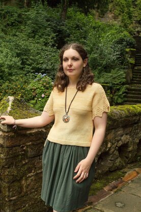 As the dawn rises, this delicate top is perfect to wear on summer mornings. The elegant lace sleeves and neck edge are knitted flat and then joined in the round to work the body, which is finished with a garter stitch sash.