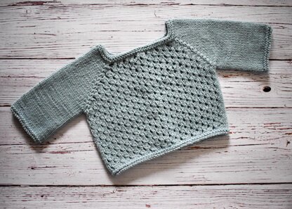 Sizes: size indicates finished garment chest size after blocking. Newborn – 43 cm / 17” 0-3 m – 47 cm / 18 ½” 3-6 m – 51 cm / 20” 6-12 m – 53 cm / 21”