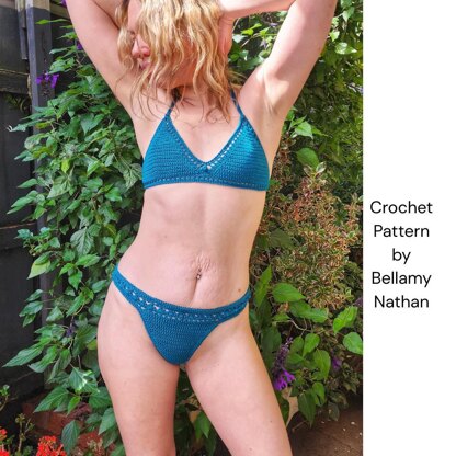 Make your own stunning swimwear with the "Amy" crochet bikini pattern! This beautiful set features a flattering bra top and thong style bottom that's perfect for beach days and poolside lounging.