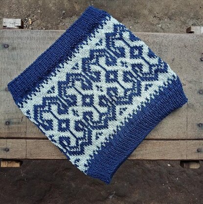 It’s a stranded knitting cowl with ribbing at the top & bottom edge, worked in the round. The design of this pattern is based on traditional motif of tenun ikat Toraja from South Sulawesi, Indonesia.
