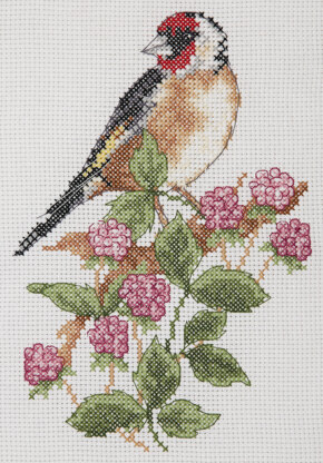 Ce kit de point de croix pour débutants présente un charmant chardonneret perché parmi des baies automnales.