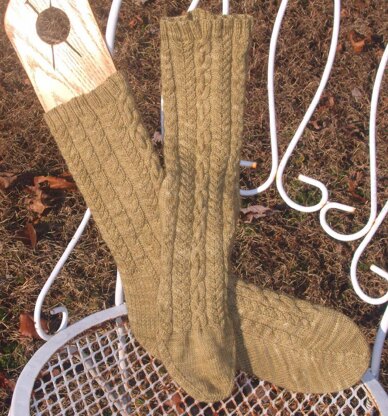 Even though the myth of the symbolism associated with traditional Aran stitches was thoroughly debunked by Ms. Starmore and others, I’ve chosen to play on that symbolism with this design. Anchor chain cables (symbolic of hope and tranquility), surrounded by horseshoe cables (symbolic of luck), and staggered rope cables (symbolic of fruitfulness), adorn the leg and instep of this design. Thus, with this pattern I wish the wearer hope and tranquility, luck, and fruitfulness.