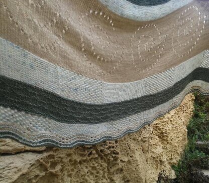 Ancient Spirals ShawlThis shawl is a classic feminine light and floaty crescent shawl, packed with different textures as you work through your yarn colours, creating sections of lace and knit & purl patterning, some relaxing garter stitch thrown in here and there, so there is always something new to delve into *! Historical theme detailed in notes*Materials: Some testers found they ran low / out of the Yarn B so you might want to plan to use a yarn for Yarn B that you have a little extra of (For instance for Yarn B the actual amount used by myself was 95g, but I have rounded it up to 100g in the yarn requirements in the same way as detailed above, which was done for all the yarn amounts)