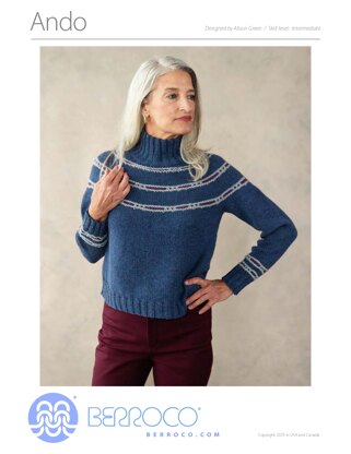 Bands of slip-stitch colorwork adorn the circular yoke and sleeves of Ando, giving beautiful focal points as well as tons of color-combination potential. This pullover is knit seamlessly from the top of the ribbed neck down, with short row shaping creating a great fit. The simple elegance of Ando lends itself to dressing up or down for a comfortable layer no matter what your schedule has in store.