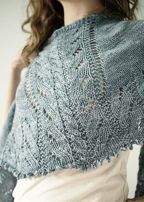 This shawl is worked from the top down. It begins with an elongated garter stitch tab. The main body of the shawl is worked in stockinette with a cable and lace center panel, and it is finished with a lace border.