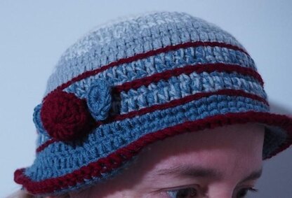 Angeline is a cloche hat. It uses fingering yarn held double and three colours to create a gradual tonal change and a contrast colour on the final row of the brim.