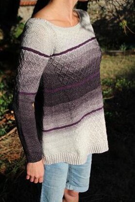Angie is a seamless sweater knitted from the top down. You start with the neckline rib and raglan increases will then separate the body and sleeves and work body in round to the end. You alternately work a chevron pattern, a contrasting stripe and diamond pattern. The back is slightly longer than the front with a few short rows at the end. The sleeves are knitted in the round to end. The raglan is detailed row by row for each size. Print only the pages you need. Have fun !