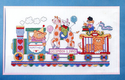 Designed by: Linda Gillum. This circus announces your baby’s arrival, with all the details you want to share with family and friends. This design features fun little bears, a seal, a panda, a mouse, and a bunny. Suggested colors are easily changed to match baby's room decor. Chart included for letters and numbers.