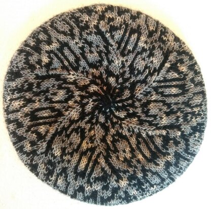Beret is worked in two colours of fingering or sock yarn. Perfect for two handed Fair-Isle technique. The chart has no more than 4 sts of each colour used before switching to the next colour. The floats on the wrong side are very small. You will not have to do any twisting! Band is sized to fit adult head size 20 - 24 ins / 51 - 61 cm, with a negative ease of 2 - 4 ins / 5 - 10 cm.