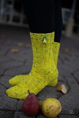Named for Pears as this collection resembles the lovely colors of a variety of pears but also because everyone loves a little play on words, especially a former English teacher. Thus, the Pears of Socks Collection. But please, choose some bright colored tweed yarn and cast on!