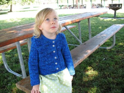 Annabelle is a girls’ cardigan featuring lace, Bavarian stitches and edges of seed stitch. It is sized from children’s size 2-12 and worked with sport-weight yarn in pieces and assembled.