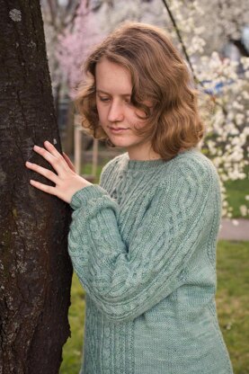 Annalee is a top down seamless raglan pullover that is knit in the round. It features a 2x2 ribbed neckline that has Japanese short rows at the back of the neck to create a comfortable fit. The yoke of the sweater is shaped with raglan increases, while the arms, front and back are simultaneously knit creating intertwining cables in the Aran tradition. The hem of the body is finished off with 2x2 ribbing. The sleeves do not have decreases down their length, but rather have a slight bell shape just before the cuff, where they are taken in, to a fitted cuff. The cuff is also worked in 2x2 ribbing.